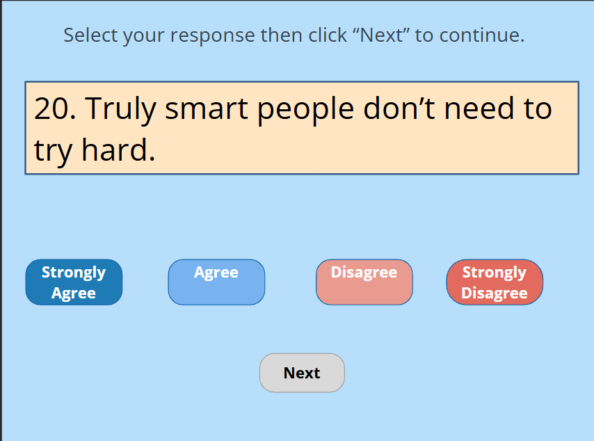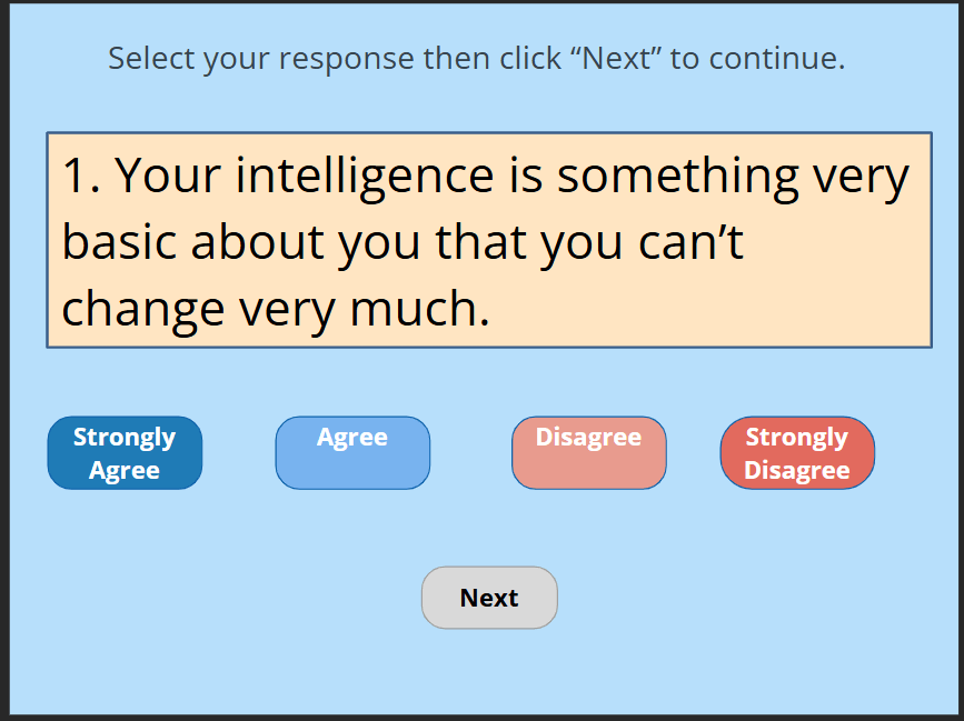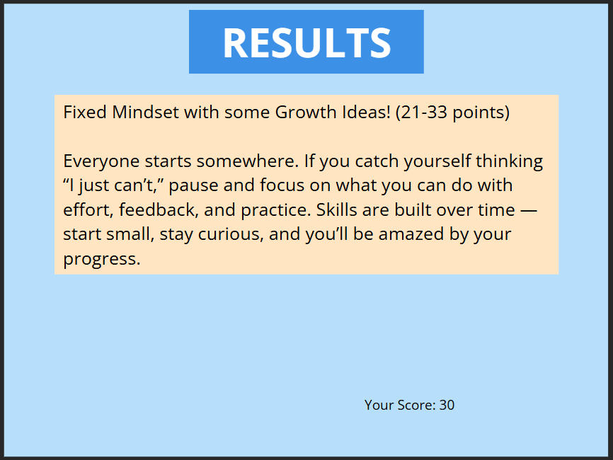I digitized a paper-based growth mindset assessment developed by Carol Dweck, converting it into an interactive Articulate Storyline experience for adult learners. The digital version automated scoring and simplified result interpretation.