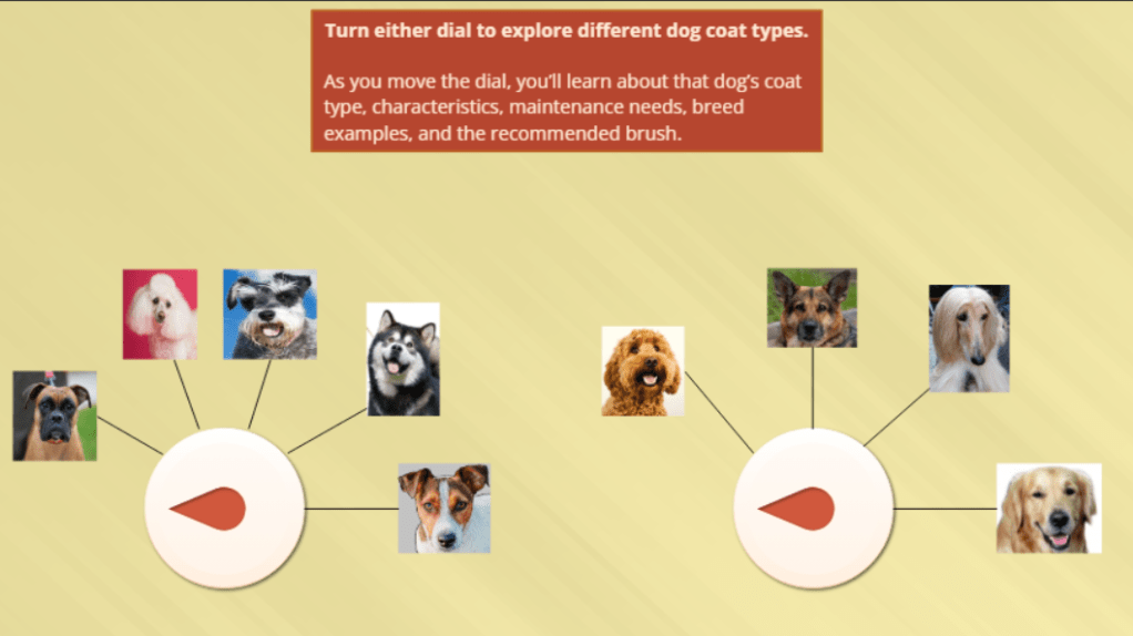 I designed a single-slide, dial-based Storyline interaction that allows learners to explore dog coat types through visual comparison and active engagement.