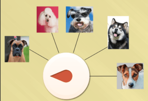 - Radial visual connectors linking coat types to representative dog images